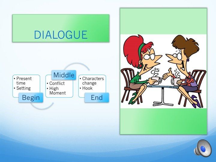 When characters talk to each other in a scene, the scene shape still applies. The beginning dialogue or brief narrative needs to describe the time and place, along with a few sensory details that evoke sights, sounds, and so on. Dialogue as action commences according to what needs to be accomplished in the scene. A conflict builds to a high moment and ends with the characters being changed, along with an incomplete solution or another conflict that leaves the reader wanting to see what is going to happen next.